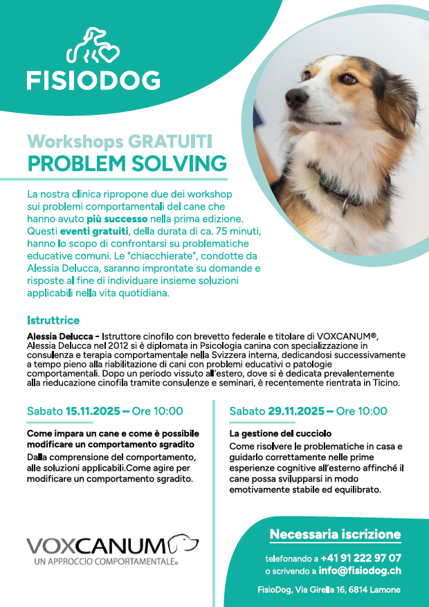Evento gratuito, iscrizione obbligatoria scrivendo a: info@fisiodog.ch